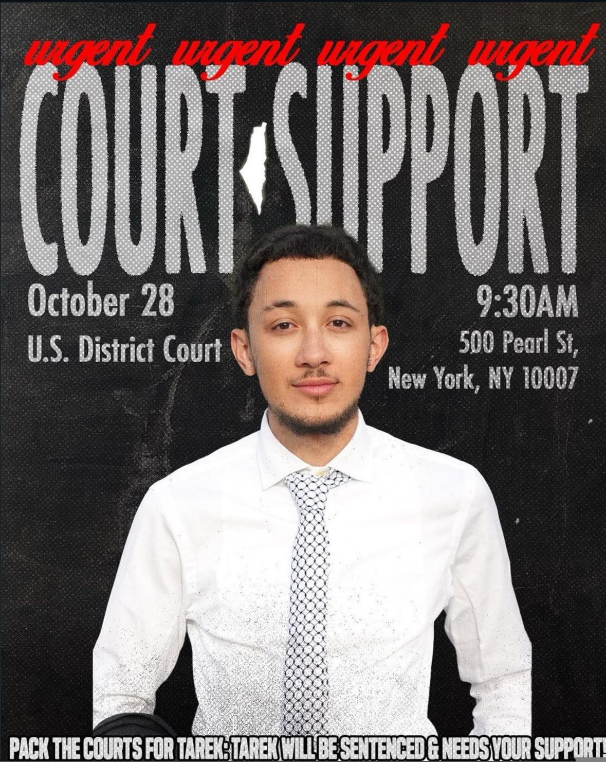 After being held in Metropolitan Detention Center Brooklyn for nearly six months now, Tarek is being sentenced. Tarek is facing up to five yeas in federal prison at just 20 years old, one of the youngest political prisoners in the Free Palestine movement.