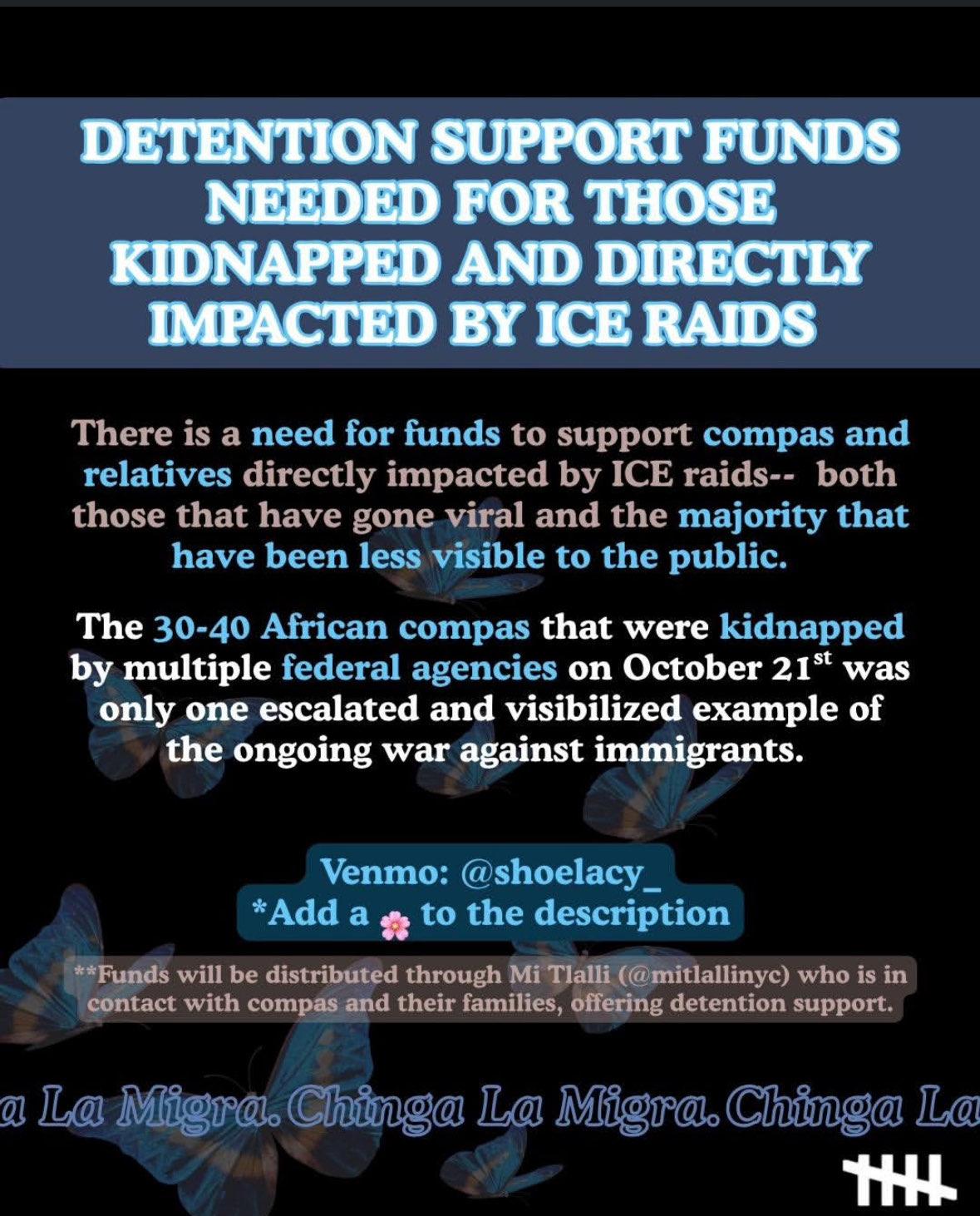 There is a need for funds to support compas and relatives directly impacted by ICE raids – both those who have gone viral and the majority that have been less visible to the public.